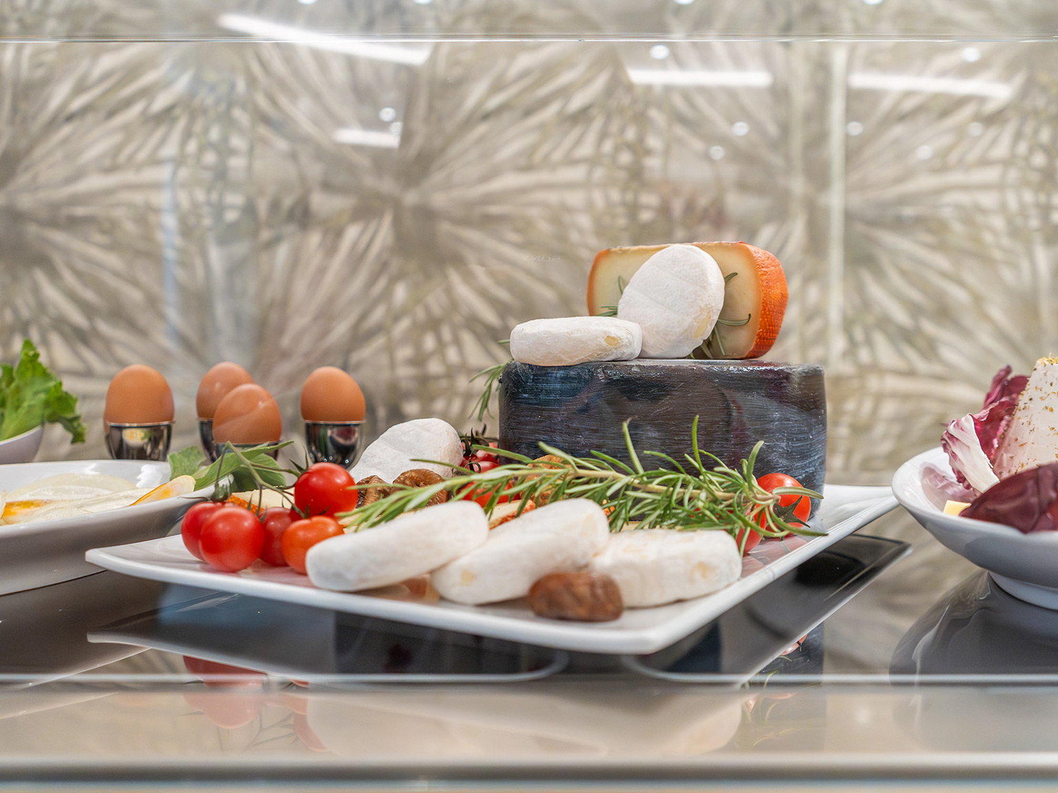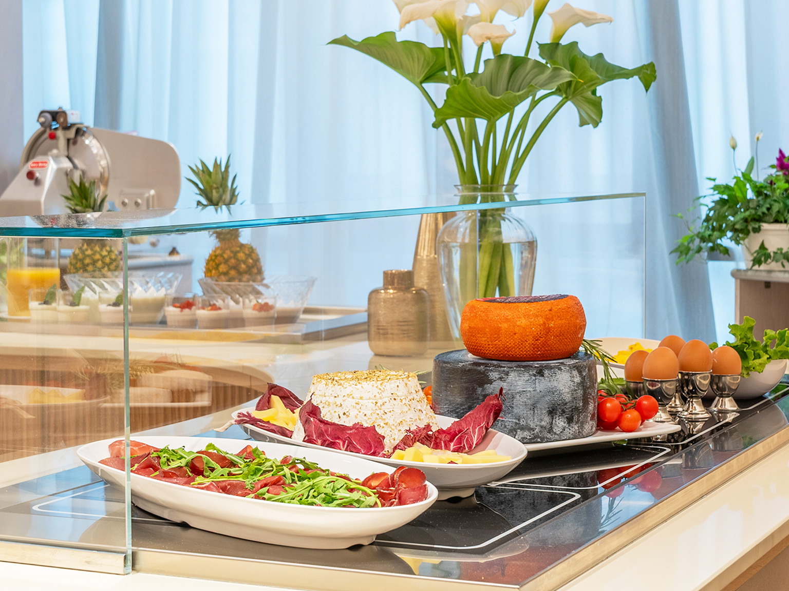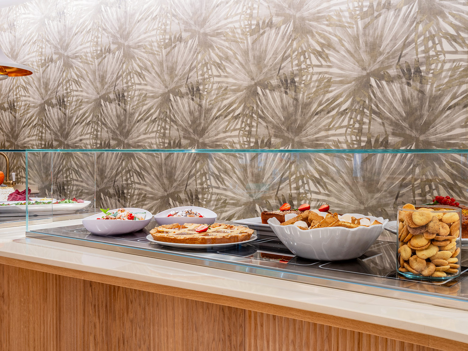 Kommen Sie in den Speisesaal, dort finden Sie ein großes Büffet mit süßen und salzigen Angeboten.