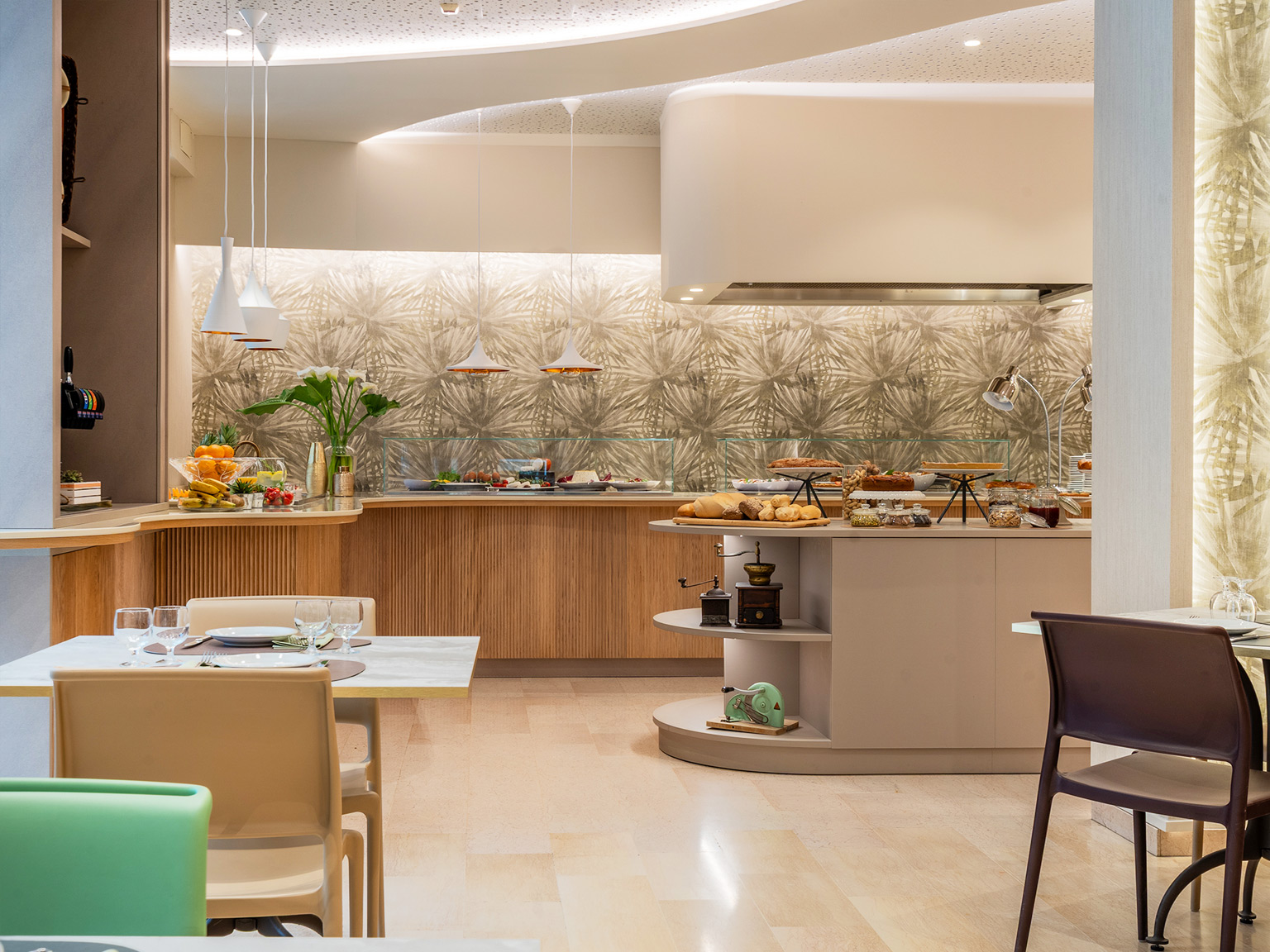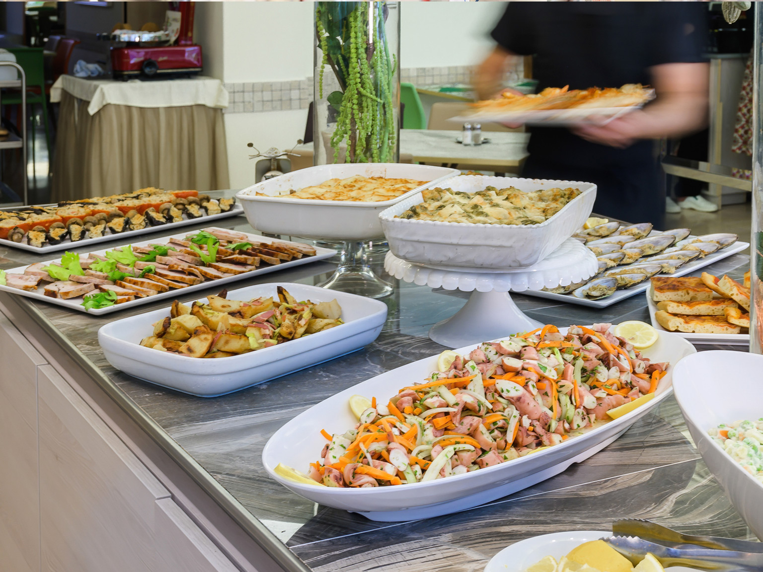 Das Büffet ermöglicht es, selbständig die verlockenden Sachen auszusuchen, und auch die Portionen. Siehe zum Mittagessen, siehe zum Abendessen, erwartet Sie eine reichliche Auswahl von gesunden Produkten, die mit viel Liebe vorbereitet werden: drei Vorspeisen, drei Hauptgerichte, Zutaten, verschiedene Salate, gekochtes Gemüse oder gratiniert…
