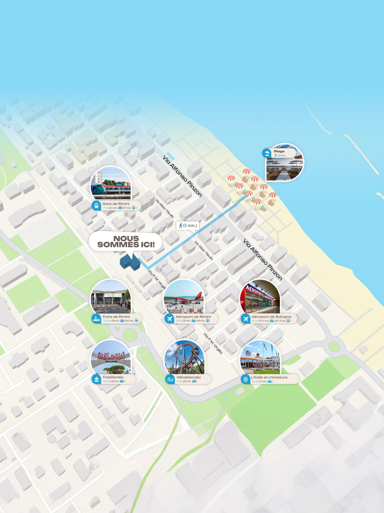 - En arrivant de l’autoroute A14, sortir à Rimini Nord et suivre les indications du plan proposé pour rejoindre l’hôtel.